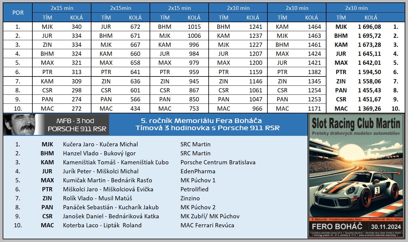 tri jazdy v trvaní dovedna 30 minút a súčet kôl zo všetkých 6 jázd týmu určil